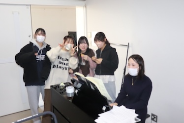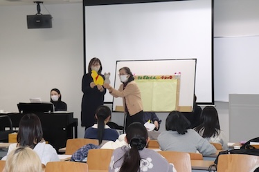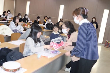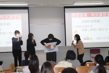 子ども教育学科幼稚園教諭・保育士コース1年生は、1月26日から初めての幼稚園教育実習が始まります。年内最後の実習指導では、現場の先生方4名とピアニストの先生をお招きし、「保育の玉手箱」と題し、講習会と最後にご講話をいただきました。一日の流れに沿って、朝のうたからお帰りのうたまでの中で、いろいろな遊びや製作、リズム遊びなどを実際に体験し、先生方の環境構成や声掛け、興味の引き出し方など多くを吸収しました。またすべてピアノの生演奏で今回は行い、学生からはこんなふうにピアノを弾けるようになりたいとの声もあがりました。最後は、先生方への質問タイムを設け、授業が終わってからも質問に来るなど、一人ひとりが不安を少しは解決し、希望とワクワクをもって実習へと歩み出せるのではないかと感じました。実習は一人ですが、このようにみんなでサポートするチームがしっかりあります。こうした学びを経ながら、一歩ずつ保育者に近づいていく学生とその学びを支えていきたいと思います。引き続き本学科では、こうした現場の先生方を招いての実践的な授業も大切にしていきます。