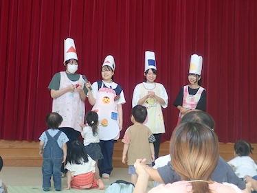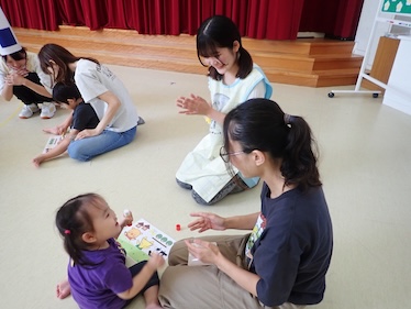 さて、学生の自己紹介から活動がスタートです! 「グーチョキパーで何つくろう」の手遊びから、「おいしい〇△▢レストラン」のエプロンシアター。子どもたちの反応を見ながらクイズ形式にするなど、臨機応変に演じました。いろいろな形に興味をもった子どもたち! 地面には大きな〇△▢の枠があります。続いて、ピアノに合わせ列車になって遊戯室内をくるくる周り、学生が言った形にお引越しです。最後は、自作の〇△▢の動物パズルや、シールを自由に使っての形づくりを楽しみました。シールで自分なりにいろいろな形を作る子どもたちの姿を見て、学生も大変学びになりましたもちろん、計画通りに上手くいくはずがありません。子どもや親さんの姿を見ながら、臨機応変に関わることが大切です。子育て支援や地域子育て支援実習での学びを活かし、さっと親子の輪に入ったり、一人でいる子どもに声を掛けたりと、学びの繋がりも実感しました。これからもこうした実践を通して、保育や子育て支援、素材との関わりなどについて学びを深めていきます!