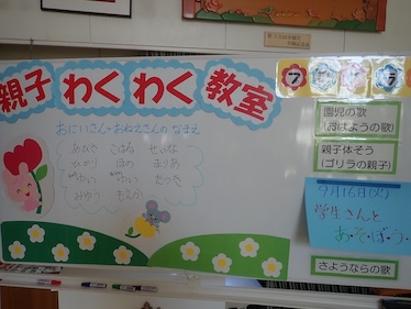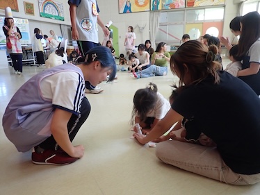 本学附属幼稚園では未就園児親子教室「親子わくわく教室」を9月16日(火)に開催しました。梅田ゼミ3年生11名で企画・運営を行いました。夏休み前より、発達に応じた素材やその関わりを考え準備を進めてきました。今回は「いろ~んな形であそぼう♪」という活動名で、子どもたちが〇△▢といった形に興味をもち遊びを拡げていけるように、また親子との関わりも生まれるように考えました。活動前の手遊び歌やしあわせなら手をたたこう、ゴリラの体操にも親子の中に入って一緒に活動に参加しました。こうした活動が子どもたちや親さんに安心感を与え、また学生自身の緊張も少しほどけたようでした。