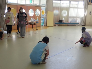 早く集まり、後から使う〇△□のリトミック活動の準備です。