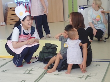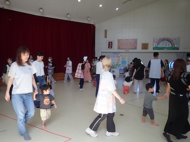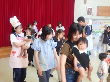 ピアノに合わせて動きながらも、いろいろな子どもたちや親さんと関わっていきます。