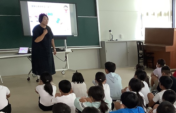 講演では、子どもたちに向けて「栄養」「食事のバランス」「食事のポイント」など、基本的生活習慣の確立を目的とした内容をわかりやすく紹介しました。