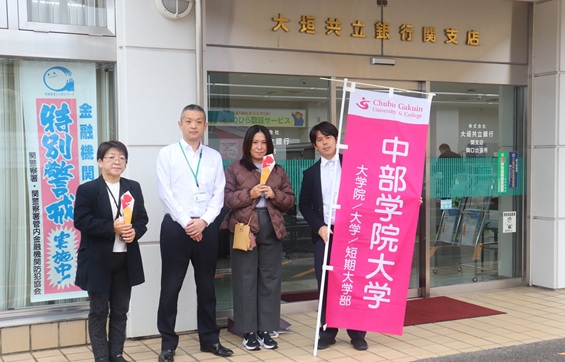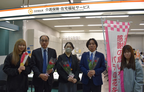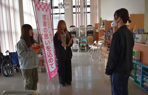 本学では学生による介護の日の啓発活動を続けており、今年も介護を学ぶ学生が大学近隣の介護施設、特別支援学校を訪問し介護に携わる人たちにバラの花を渡し感謝を伝えるとともに、地域の福祉の充実・発展等に関し協定を締結する関市役所、大垣共立銀行、JAめぐみのなどを訪問し介護の日啓発活動チラシを届け、介護の日の啓発を行いました。