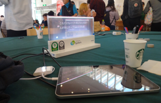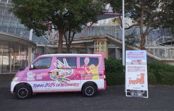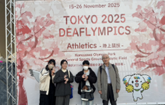 11月24日、人間福祉学部の手話サークルに所属する学生3名と教員が観戦と応援に行ってきました。最初に国立オリンピック記念青少年総合センターで開催された「デフリンピックスクエア」を見学しました。会場には国際手話を学ぶコーナーやデフスポーツ体験コーナーなどいろいろなコーナーが設けられ見学者で賑わっていました。特に目を引いたのは「デジタル技術展示・体験ブース」でした。透明のディスプレイを真ん中に置き言葉が即時に文字となって表示される端末や、手話を読み取って文字にするものなど、デジタル技術を使ったコミュニケーションツールの開発に驚きました。