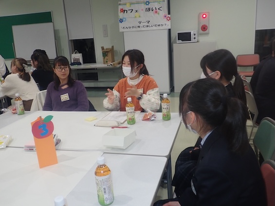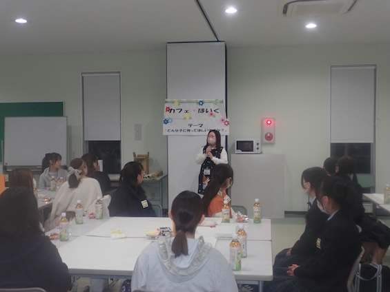 11月27日(木)、各務原市こども政策課主催の「カフェほいく」を、16:50~各務原キャンパスの新学生ホールで行いました。カフェほいくは、保育のことをもっと知りたい高校生や大学生が、公立保育者のみなさんと一緒におしゃべりし、「保育」という仕事の魅力について語り合う交流会です。高校生が8名、子ども教育学科学生が18名、現場の先生方4名の参加で、4グループに分かれて「どんな子に育ってほしいですか?」というテーマでの交流、そして「保育者に何でも質問コーナー」の2部で、和気あいあいとお話をしました。学生は緊張気味でしたが、保育者のみなさんが話を笑顔で受け止め、意見をまとめたり、学生の素朴な相談にのったりと、徐々に笑顔と活気あふれる会になり、あっという間の時間でした。最後は今回のテーマに沿って、アドバイザーの梅田先生から、実体験や絵本を用いてのコメントが行われました。「保育者になることを決めました!」と語った学生もいたようで、大変充実した会になったようです。引き続きこうした現場の先生方との交流を大切に、保育の魅力を発信していきます!