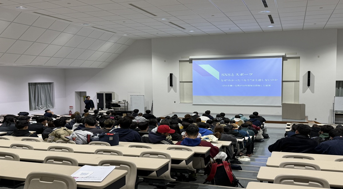スポーツ健康科学部では、運動系インフルエンサーの八木一憲氏を講師にお招きし、特別講演「SNSとスポーツ なぜ“わかったつもり”は上達しないのか — SNSを嫌いな僕が10年間毎日投稿した結果 —」を実施しました。本講演は、学生がスポーツを取り巻く情報環境やSNSの影響について理解を深めるとともに、現代のスポーツ指導や自己成長における“学び方”や“情報との向き合い方”を考えることを目的としています。八木氏からは、SNSを通じた情報発信の実体験をもとに、「見るだけ・知るだけ」で終わってしまう“わかったつもり”の危険性や、上達・成長につなげるために必要な主体的な取り組みの重要性について、具体例を交えながらわかりやすくご講演いただきました。また、SNS時代におけるスポーツ選手・指導者としての発信のあり方や、情報を受け取る側としてのリテラシーについても示唆に富んだ内容となりました。