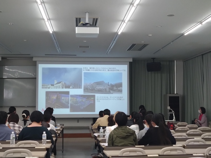 内藤教授からは、大学4年間の教育課程や国家試験対策のサポート体制、チャペルのあるグレースホールで行われる戴灯式、さらに3色のユニフォームから学生自身が選択できることなどについて紹介がありました。参加者の中には、メモを取りながら熱心に話を聞く姿も見られました。