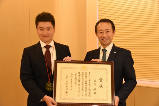 文部科学大臣杯争奪「第44回日本学生ゴルフ王座決定戦」で優勝した本学ゴルフ部の益田航(ますだ・わたる)選手(スポーツ健康科学科3年)が、3月25日、岐阜県庁を訪れ、江崎知事に大会結果を報告しました。